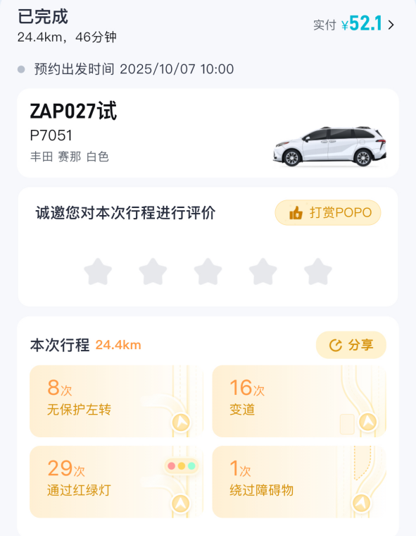 上午10点38分左右,记者乘坐的Robotaxi顺利抵达目的地。行程结束后,手机App生成的行程单显示:本次行程共计24公里,费用52.1元。更为详细的数据显示,在这段路途中,车辆完成了8次无保护左转、16次变道,顺利通过了29个红绿灯,并成功处理了1次障碍物避让。